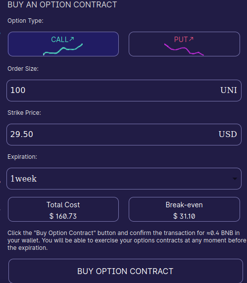 It is important to monitor the cost of the option because it is denominated in BNB. All options are paid in Binance Coin irrespective of the option's underlying asset. You must have enough BNB is in your wallet to cover the cost of the transaction to purchase the option.